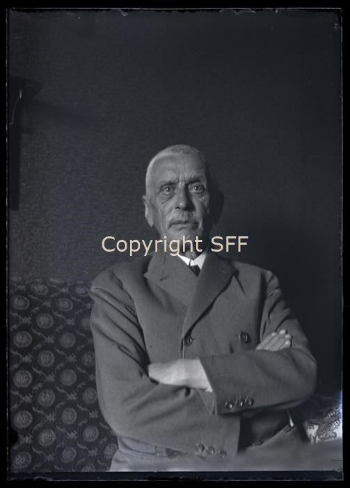 Ritratto di Michele Cimador, ripreso frontalmente a mezza figura seduto in poltrona con le braccia conserte