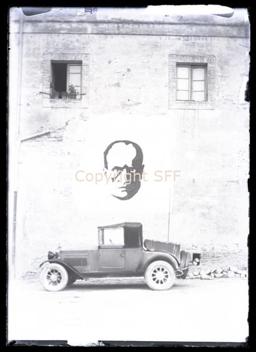 Un'automobile parcheggiata sotto un grande murale raffigurante il volto di Mussolini eseguito sulla facciata di un abitazione.