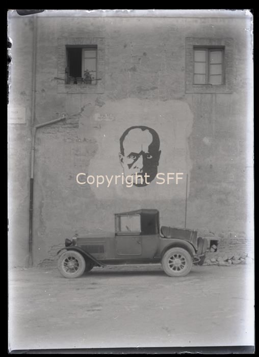 Un'automobile parcheggiata sotto un grande murale raffigurante il volto di Mussolini eseguito sulla facciata di un abitazione.