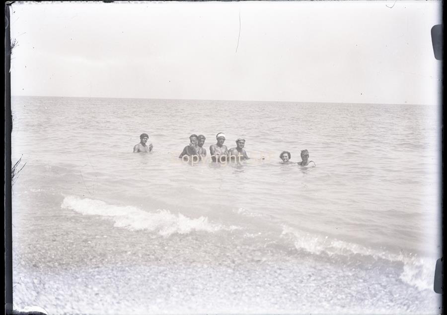 Ritratto di gruppo, sette persone in mare durante un bagno. La prima a destra è Nelda Pellis