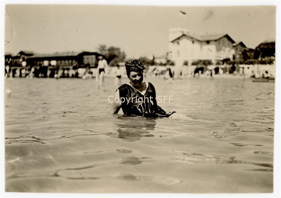 Ritratto di Nelda Pellis ripresa in mare mentre fa un bagno. Sullo sfondo si intravedono altri bagnanti e alcuni edifici balneari