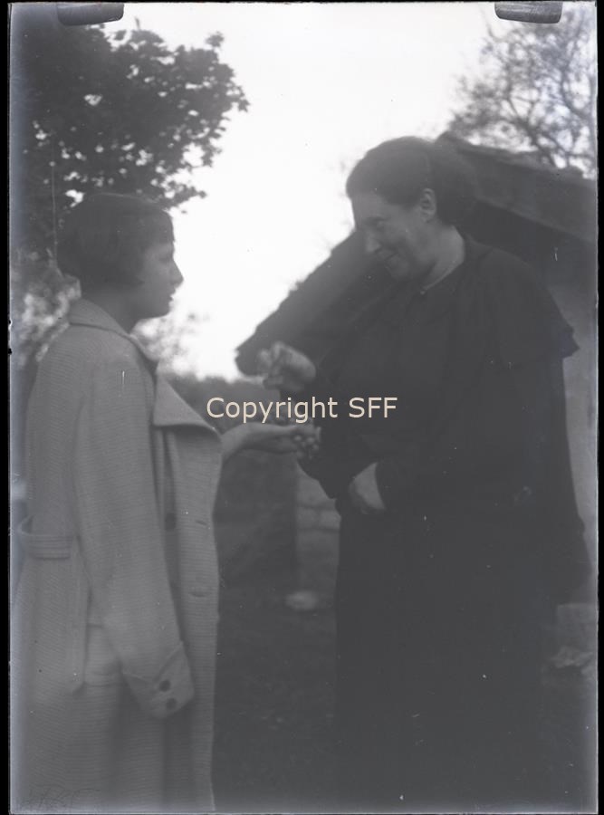 Una giovane porge dell'uva a un'altra donna. Le protagoniste della scena sono parenti di Pellis: quella a destra è la moglie Nelda, l'altra è la nipote Natalia Runco. Il fatto avviene all'aperto, vista la presenza di vegetazione e di un edificio sullo sfondo in località Pisino [Pazin]