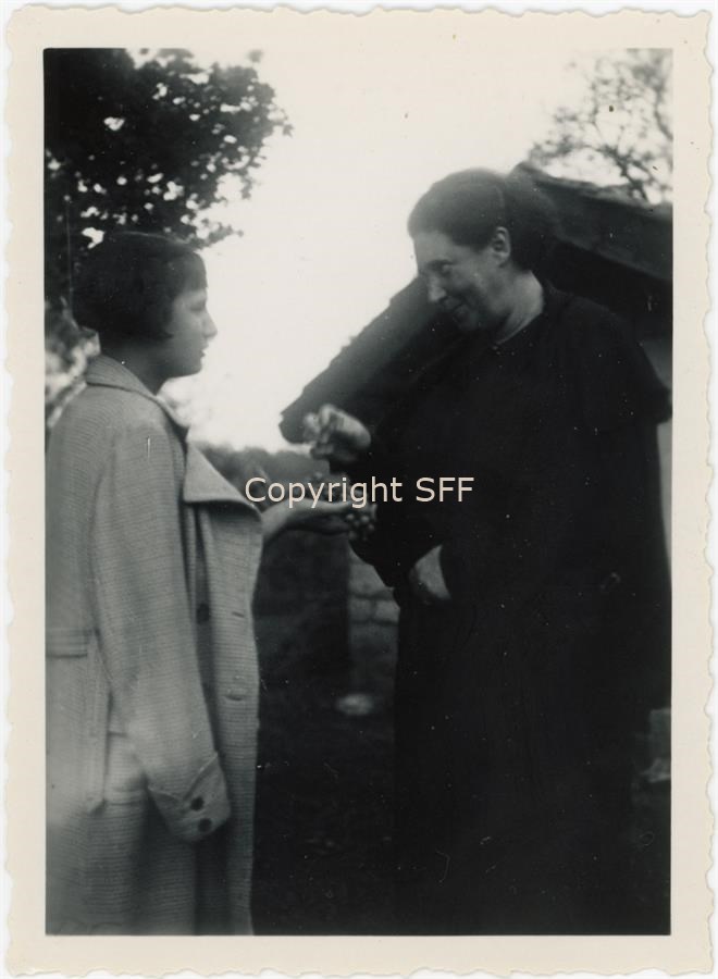 Una giovane porge dell'uva a un'altra donna. Le protagoniste della scena sono parenti di Pellis: quella a destra è la moglie Nelda, l'altra è la nipote Natalia Runco. Il fatto avviene all'aperto, vista la presenza di vegetazione e di un edificio sullo sfondo in località Pisino [Pazin]