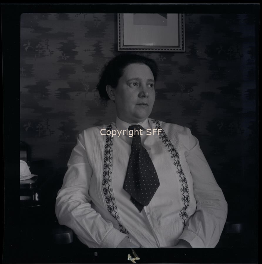 Ritratto a mezzo busto di Nelda Pellis. La donna รจ stata ripresa frontalmente con la testa lievemente girata, seduta in un ambiente domestico