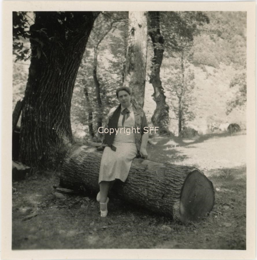 Ritratto a figura intera di Nelda Pellis, ripresa seduta su un tronco d'albero abbattuto. La foto è stata scattata in un ambiente boschivo