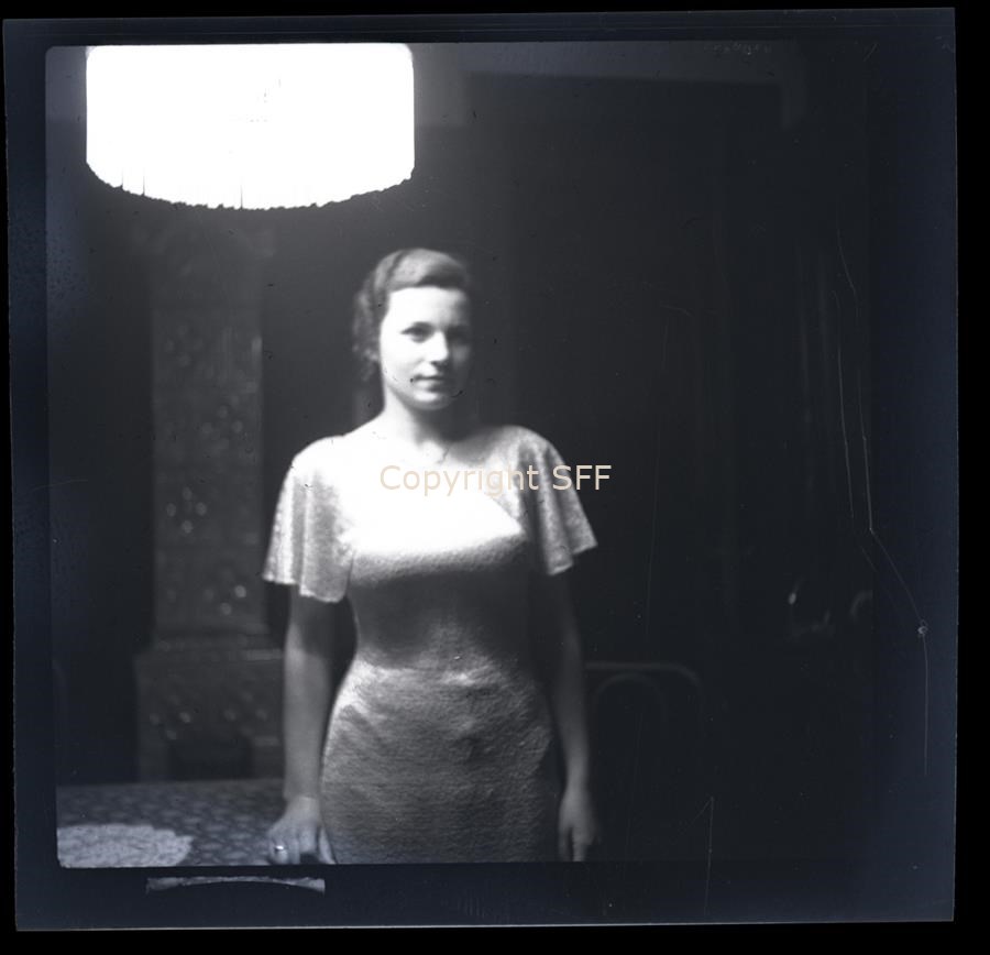 Ritratto in interno di Carmen Runco, nipote di Ugo Pellis, ripresa in un ambiente domestico, in piedi vicino a un tavolo.