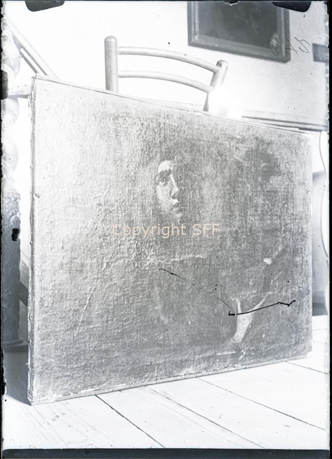 - Fotografia di un quadro senza cornice. L'opera d'arte non รจ appesa a un muro, ma appoggiata alle gambe di una sedia. La tela ritrae un volto maschile