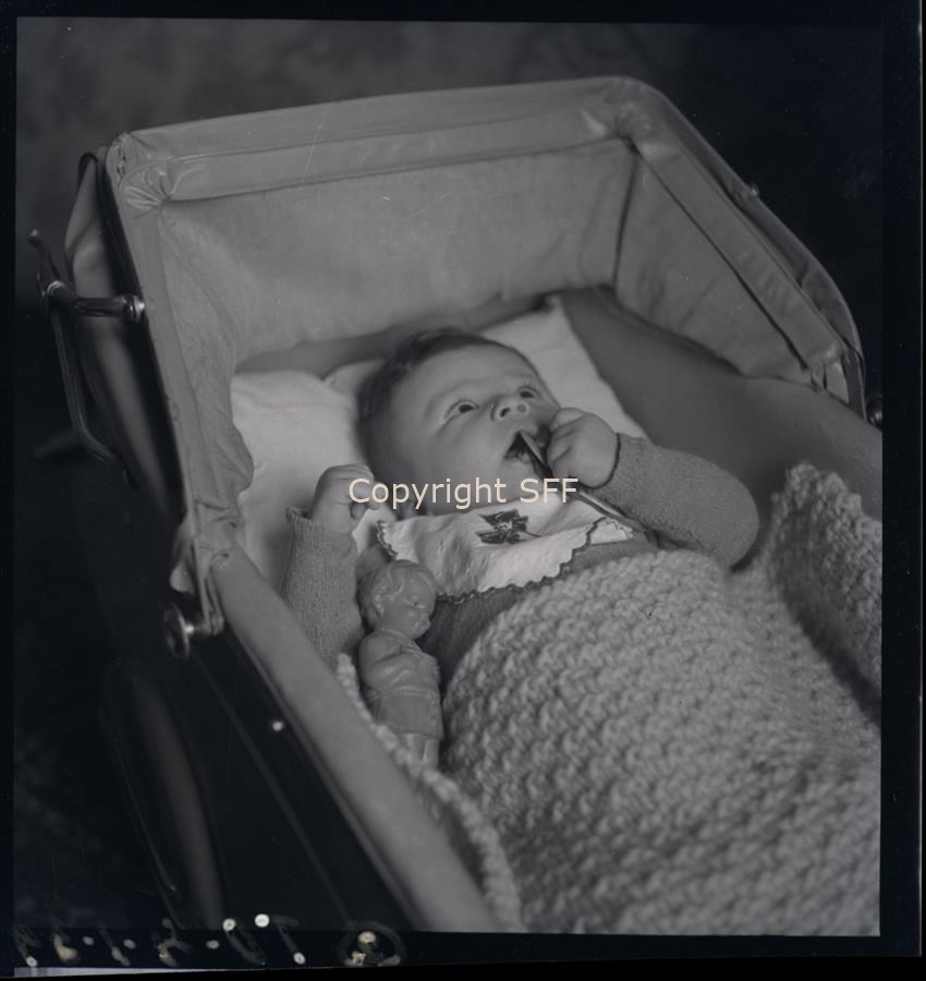 Ritratto di un bambino disteso nella carrozzina con il ciuccio in mano