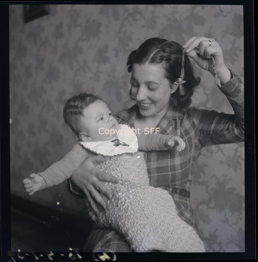 Ritratto di una donna, ripresa a mezza figura, seduta con in braccio un bimbo in uno spazio domestico