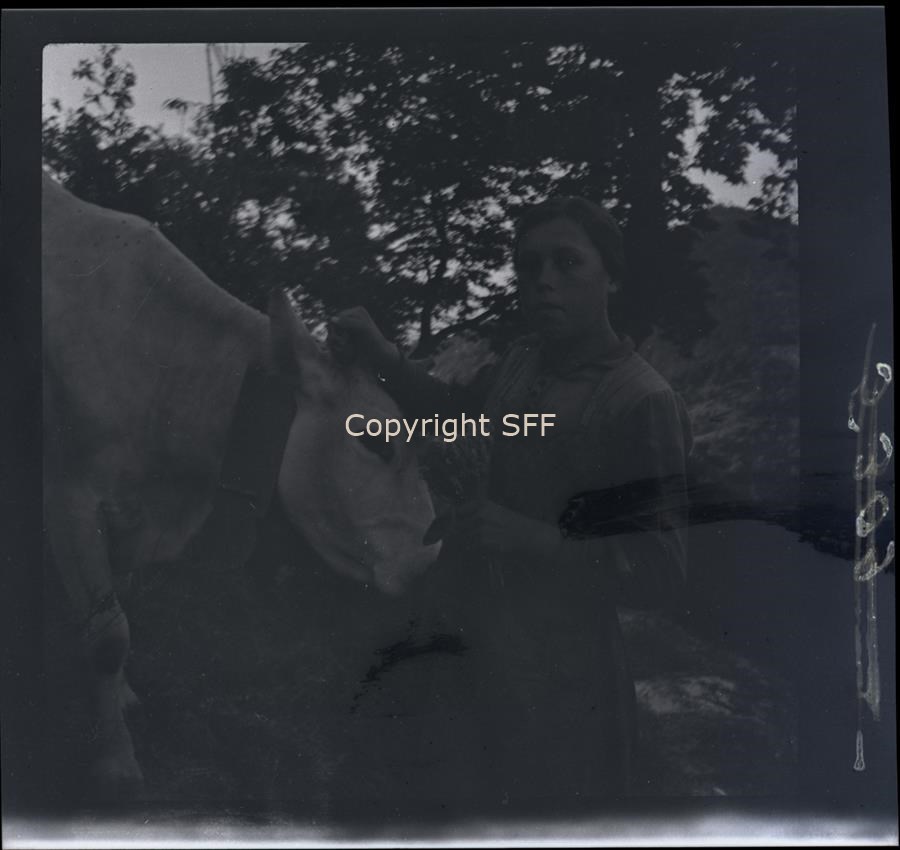 - Ritratto di una giovane mentre sta accarezzando la testa di una mucca