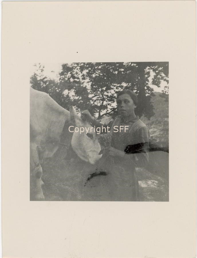 - Ritratto di una giovane mentre sta accarezzando la testa di una mucca