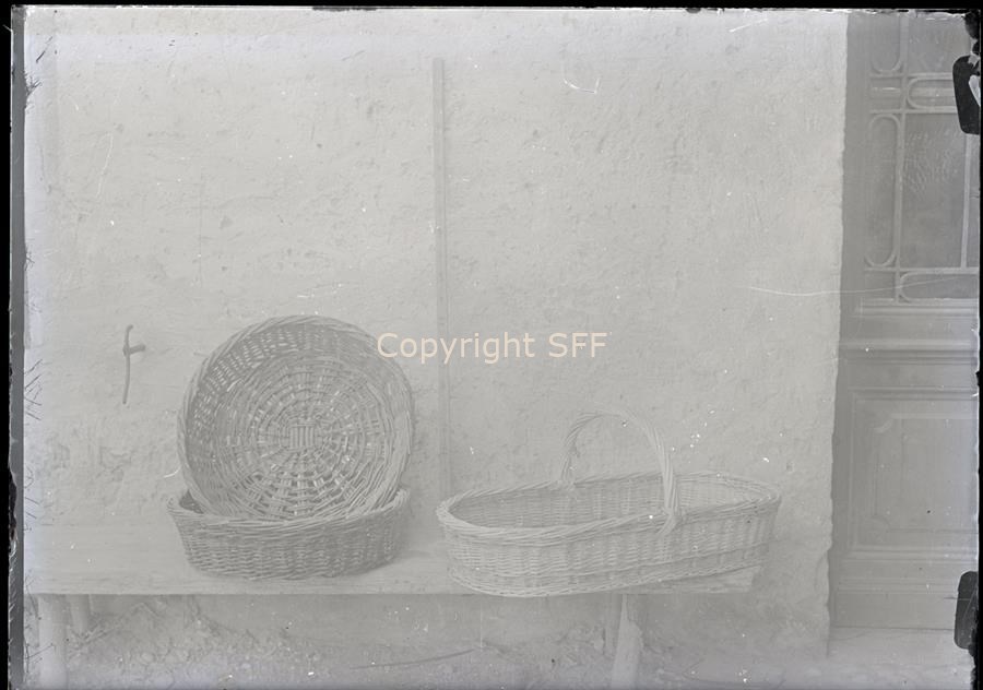 - Serie di cesti di vimini appoggiati su una panca al di fuori di un'abitazione