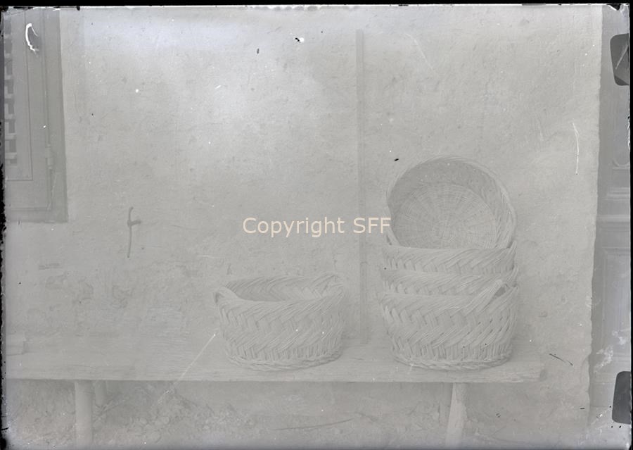 - Serie di cesti di vimini appoggiati su una panca al di fuori di un'abitazione