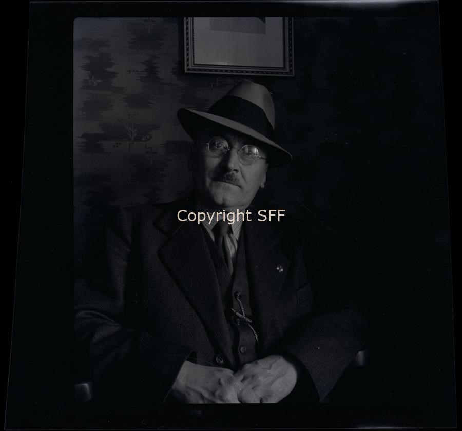 Ritratto a mezzo busto di Ugo Pellis con cappello e occhiali, seduto, eseguito in ambiente domestico.