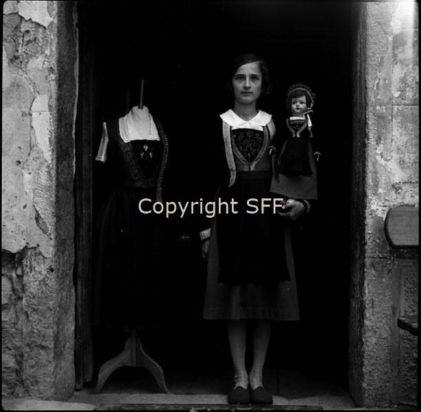 Costume da donna; ritratto di ragazza che indossa il costume locale e che tiene in mano una bambola in costume
