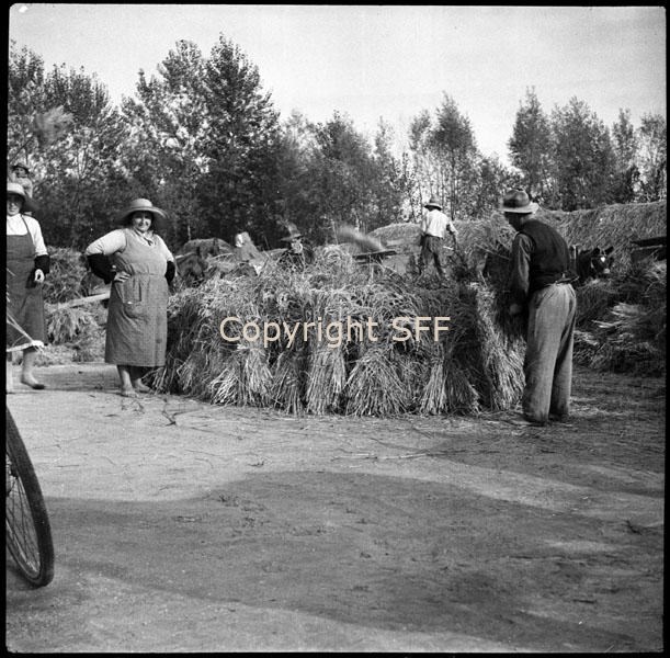 Ammasso dei mannelli di riso: donne con cappello caratteristico