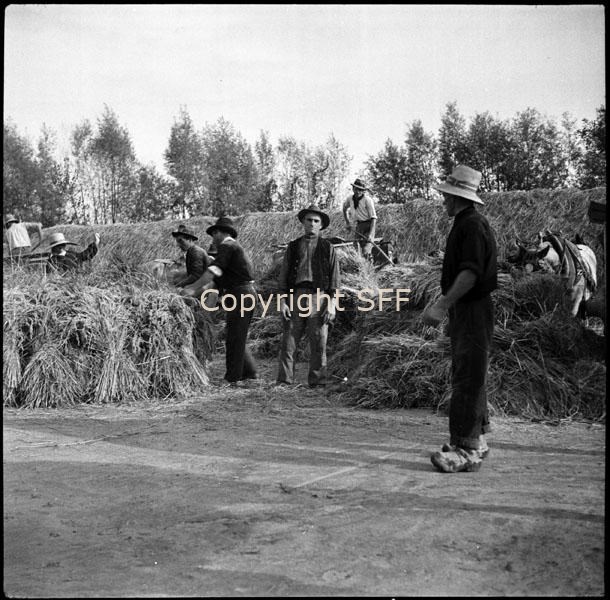 Ritratto di contadini ripresi mentre ammassano i mannelli di riso poco prima di iniziarne la battitura utilizzando i cavalli. Il contadino in primo piano indossa una tipologia di zoccoli proveniente dalla Val d'Aosta