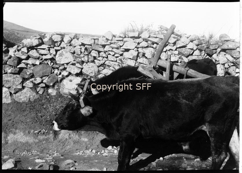 Aratro in legno con buoi al giogo
