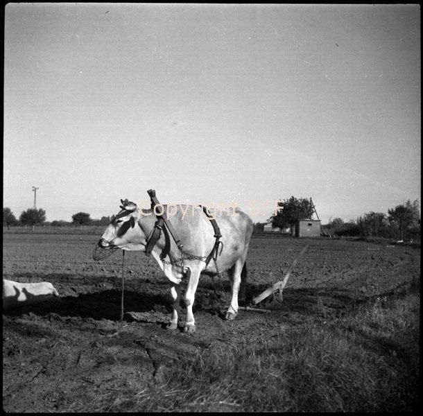 Bue con museruola attaccato all'aratro in legno