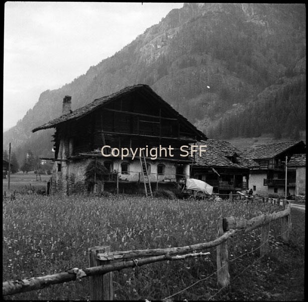 Casa in muratura e legno con ballatoio e sterno e copertura in lastre di pietra; camino laterale