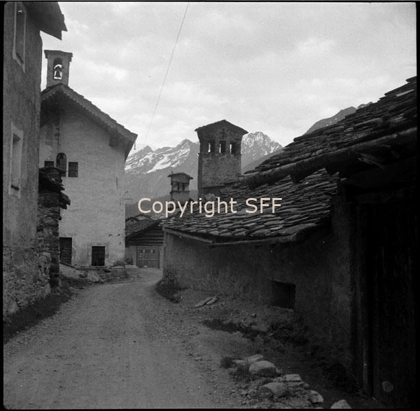 - Casa in muratura con copertura di lastre di pietra e in secondo piano piccola chiesa monofora campanaria