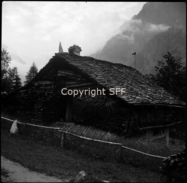 Casa in muratura e legno con copertura in lastre di pietra; al livello superiore grande deposito coperto di legname