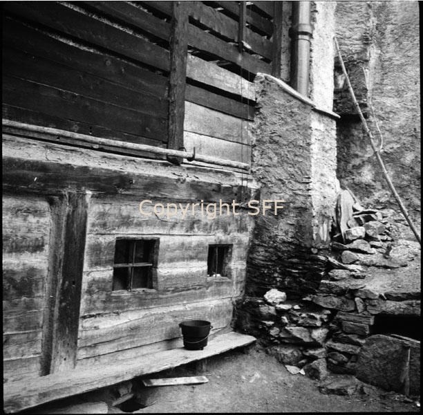 - Le due finestrelle della cucina sormontate dalle travi che formano la parete del fienile soprastante; a fianco camino in muratura sporgente