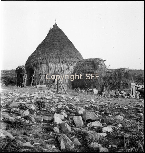 - Capanna costruita con materiali vegetali utilizzata come ricovero per i pastori; a lato: piccole capanne della medesima tipologia costruttiva adibite a ricovero per maiali e galline