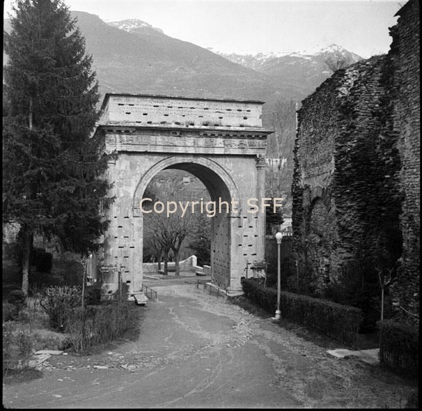 - Costruito nel 9-8 a. C; a un solo fornice con semicolonne che reggono un architrave con fregio figurato e un attico con iscrizione che ricorda il "foedus", il patto, tra Cozio, re dei Celti, e Cesare Ottaviano Augusto, primo imperatore romano.