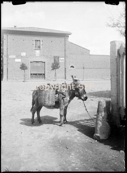 Asino con due ceste di vimini