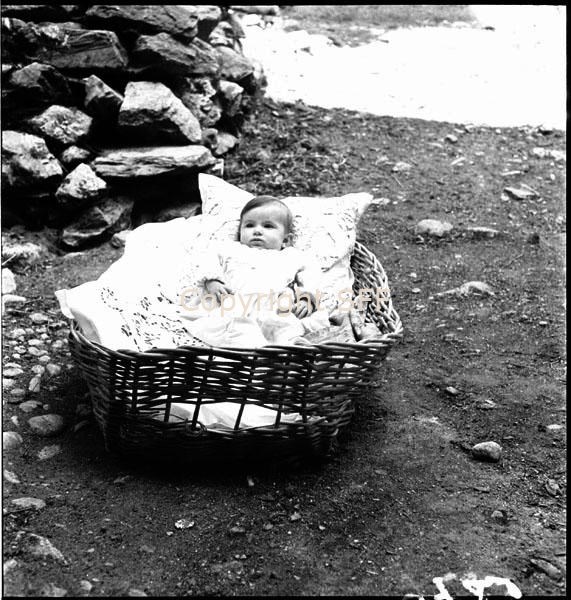 Bambina adagiata fra coltri e cuscini in una "čia" di vimini