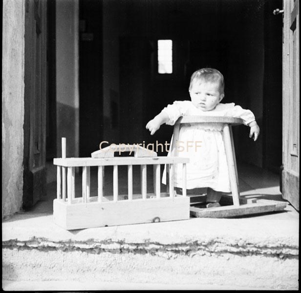 Bambina con girello e scacciapasseri