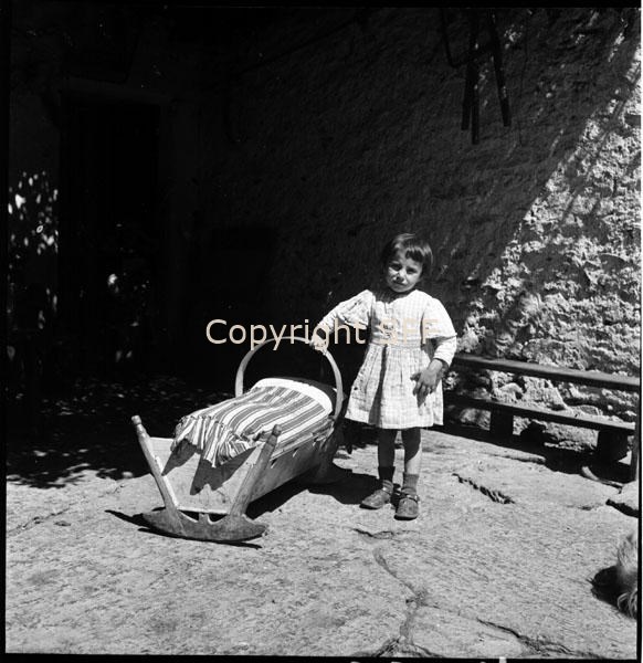Bambina in posa accanto a una culla