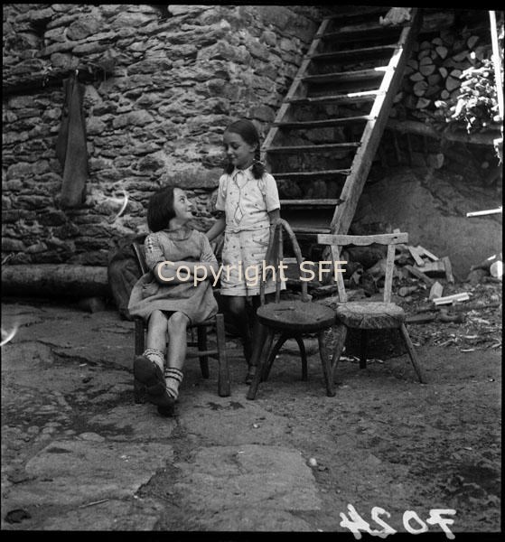 Bambine in posa fra sgabelli di fattura rustica