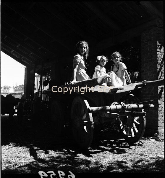 Bambine in posa su un carro ripreso da tergo