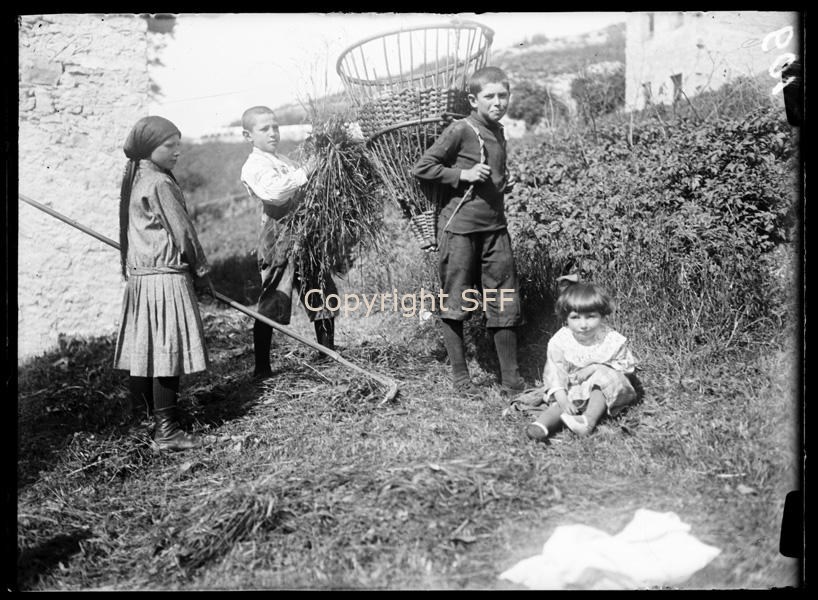 Bambini di Erto con la gerla e il rastrello