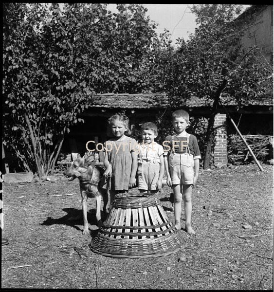 Bambini in posa accanto a una pulcinaia