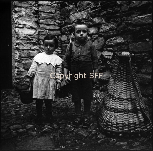 Bambini in posa con strumenti di lavoro agricolo e domestico