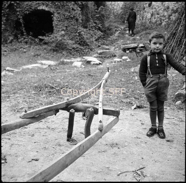 Bambino in posa accanto a giogo e timone di carro