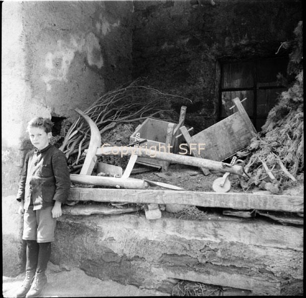 Bambino in posa accanto a un aratro