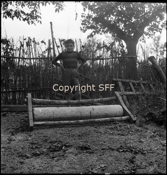 Bambino in posa accanto a un rullo