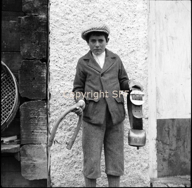 Bambino in posa con arnesi per l'allevamento bovino