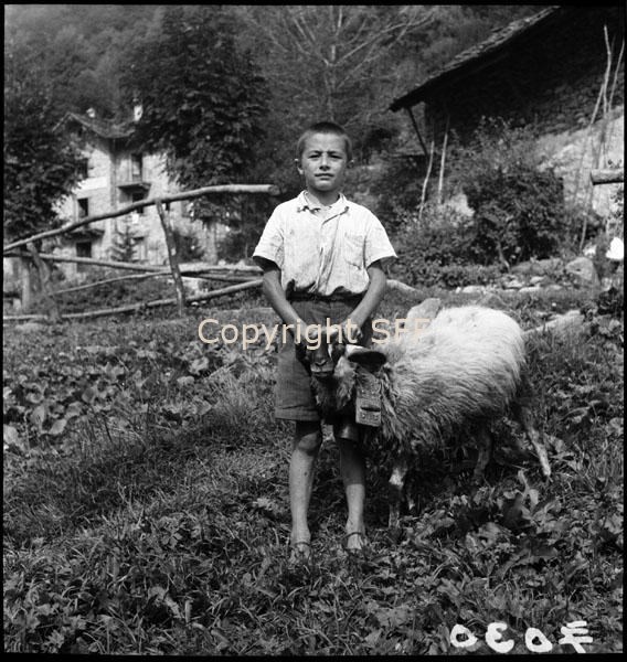 Bambino in posa con una pecora: collare con campanaccio