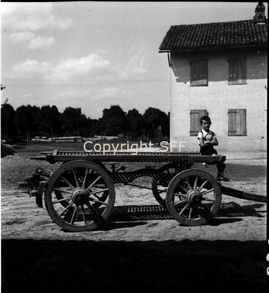 Bambino in posa su un carro con letto caratteristico a Villafranca d'Asti