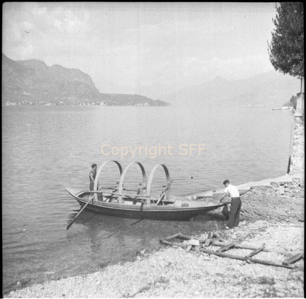 Barca da pesca sul Lago di Como a Lezzeno: pescatori al lavoro a riva