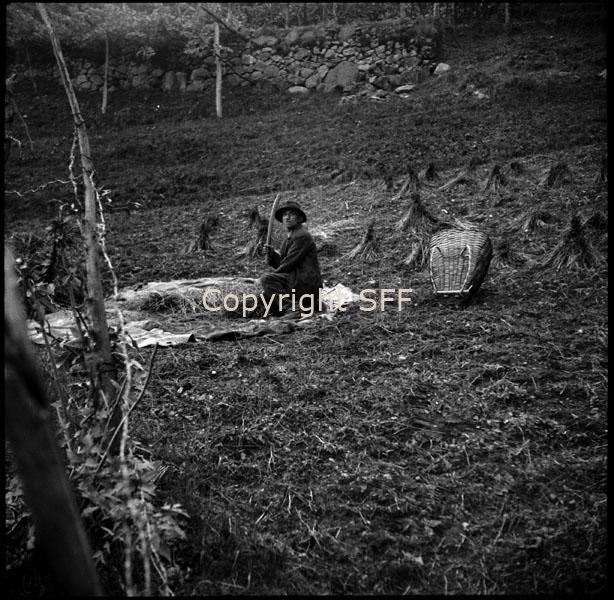 Battitura del grano saraceno: uomo in posa con attrezzo e gerla fra le biche