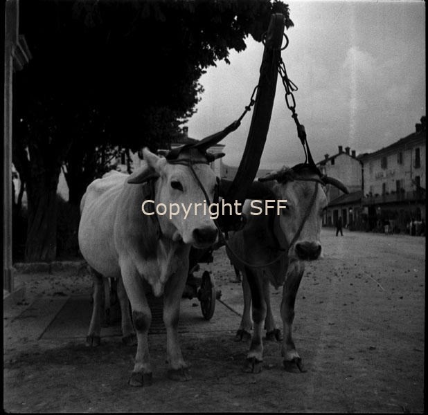 Bovini aggiogati attaccati al traino: timone, attacco, giogo, ritorte, corregge, àncole