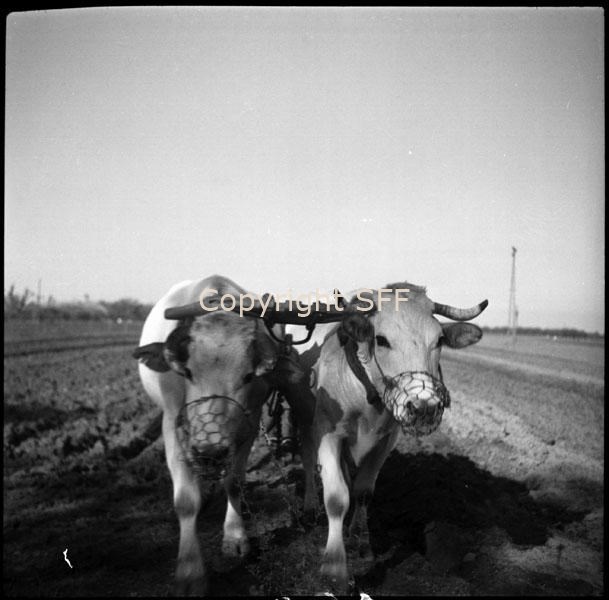 Bovini aggiogati con museruola