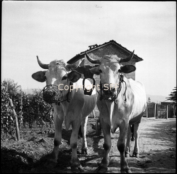 Bovini aggiogati con museruole