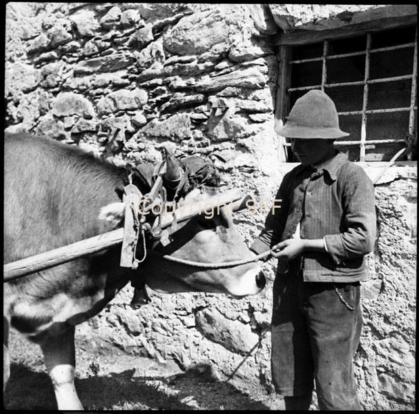 Bovino aggiogato trattenuto da un ragazzo: gioghetto e attacco ripresi di fianco
